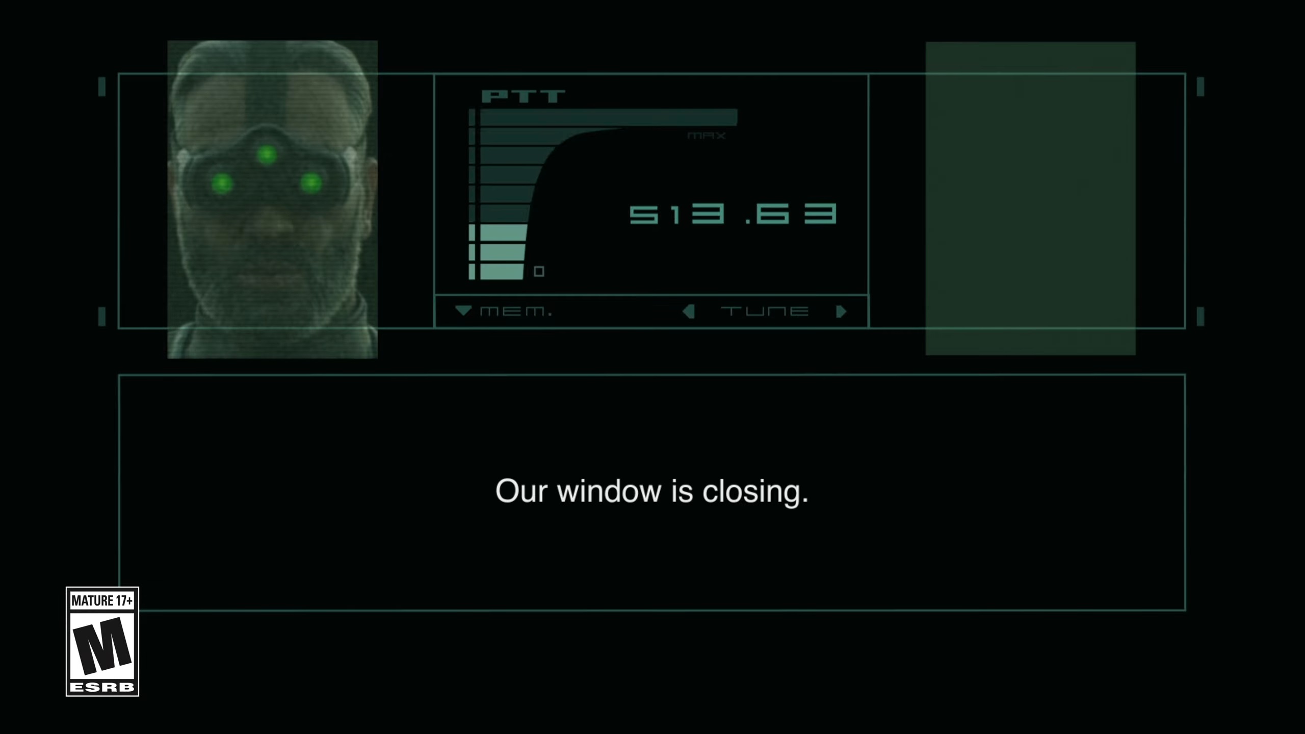 «Наше окно возможностей закрывается. У нас есть только один шанс» – говорит Сэм Фишер в защитных очках на экране связи, явно стилизованном под интерфейс Metal Gear Solid.